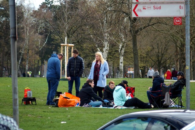 So sah es noch letzten Sonntag in den Parks aus: Obwohl von allen Experten und Politikern dringend abgeraten, trafen die Leute sich zum Grillen, Saufen und Fußballspielen in den Parks, das Wetter war einfach zu schön. Heute Nachmittag, auch bei sehr schönem Wetter, sah das schon anders aus, mehr als drei Leute in einer Gruppe habe ich nicht gesehen. So langsam scheint es durchzusickern, wie gefährlich das sein kann.