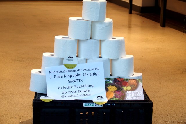 Nicht nur ich, der ich gern im Park spazierengehe (mit gebührendem Abstand zu allen anderen natürlich), würde es vorziehen, wenn es nicht zu einer Ausgangssperre kommt, auch für die Gastronomie ist es sehr wichtig: Immer mehr Restaurants stellen sich auf „Take-Away“ ein. Das war zwar bei den meisten vorher auch schon möglich, aber es wurde nicht extra beworben, und nun ist es die einzige Möglichkeit, überhaupt etwas Umsatz zu machen. Stellt sich die Frage: Kann man sicher sein, daß der Koch kein Dampfplauderer mit einer feuchten Aussprache ist? Die selbe Frage stellt sich übrigens schon, wenn man morgens frische Brötchen kauft: Hat die Bäckereifachangestellte zwar brav in die Armbeuge geniest, allerdings zu dem Zeitpunkt, als sie gerade über dem frisch aus dem Ofen gehobenen Backblech hing? Nein, kann man nicht. Ich mache folgendes: Alles, was ich von außen hole, stecke ich vor Verzehr für zehn Minuten in den 100 Grad heißen Backofen – ich hoffe, daß das im Falle einer Kontamination hilft, auf jeden Fall beruhigt es mich.