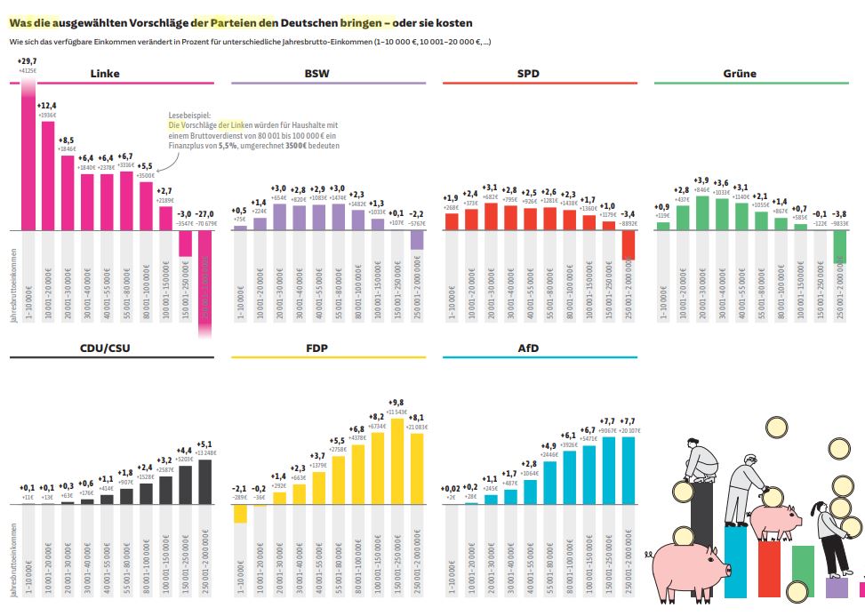 Die Süddeutsche Zeitung hat sich (am 18./19.01.25) mal die Programme der Parteien daraufhin durchgesehen, mit welchen Steuergeschenken die verschiedenen Einkommensgruppen rechnen können, und die Diagramme oben erstellt. Ich will niemanden beeinflussen bei seiner Wahlentscheidung, aber wer immer noch nicht weiß, welcher Partei er nun seine Stimme geben soll, kann sich hier zumindest ein kleines bißchen orientieren.